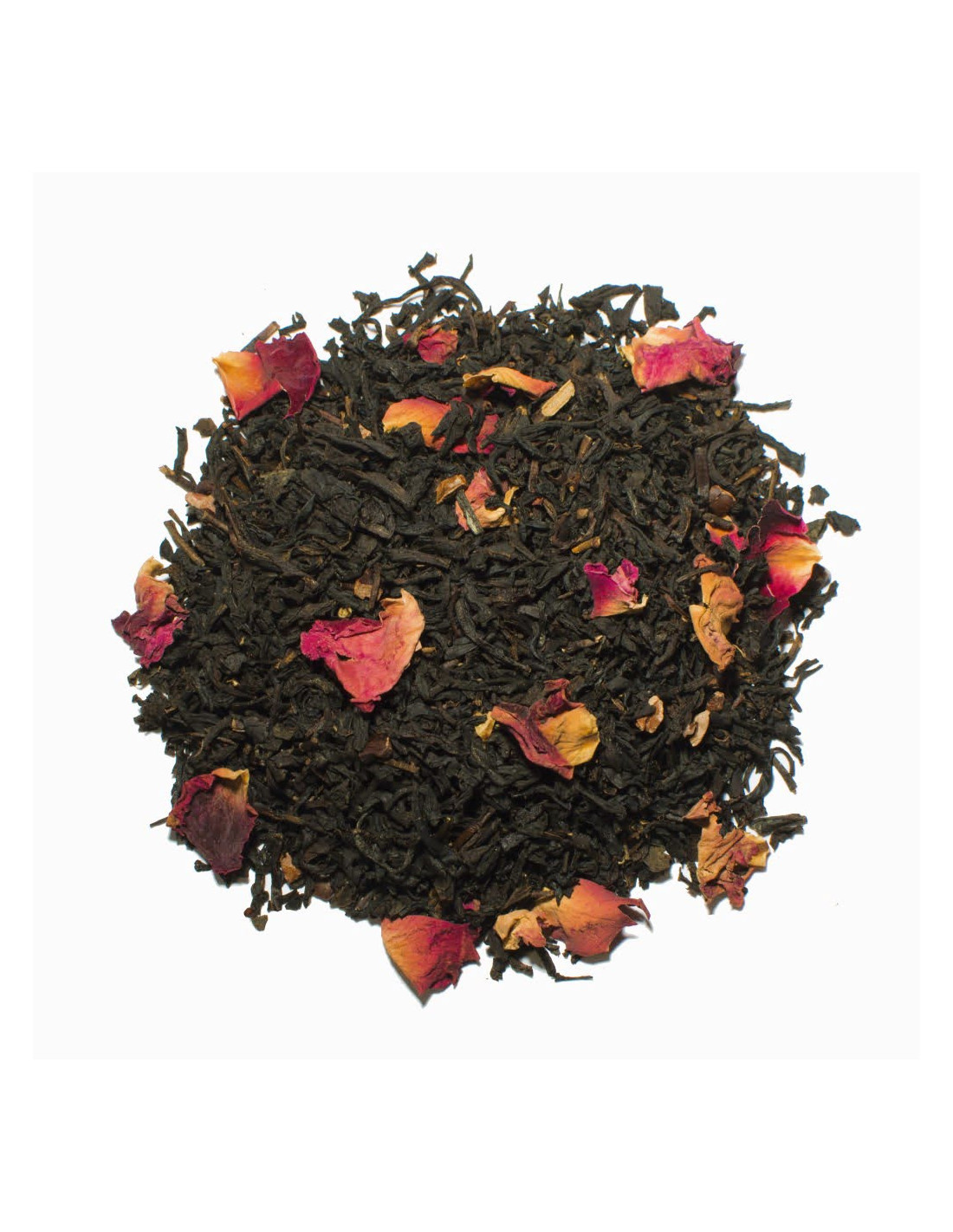 Thé noir de Chine, arôme chocolat, cerise, vanille, grué de cacao, pétales de rose