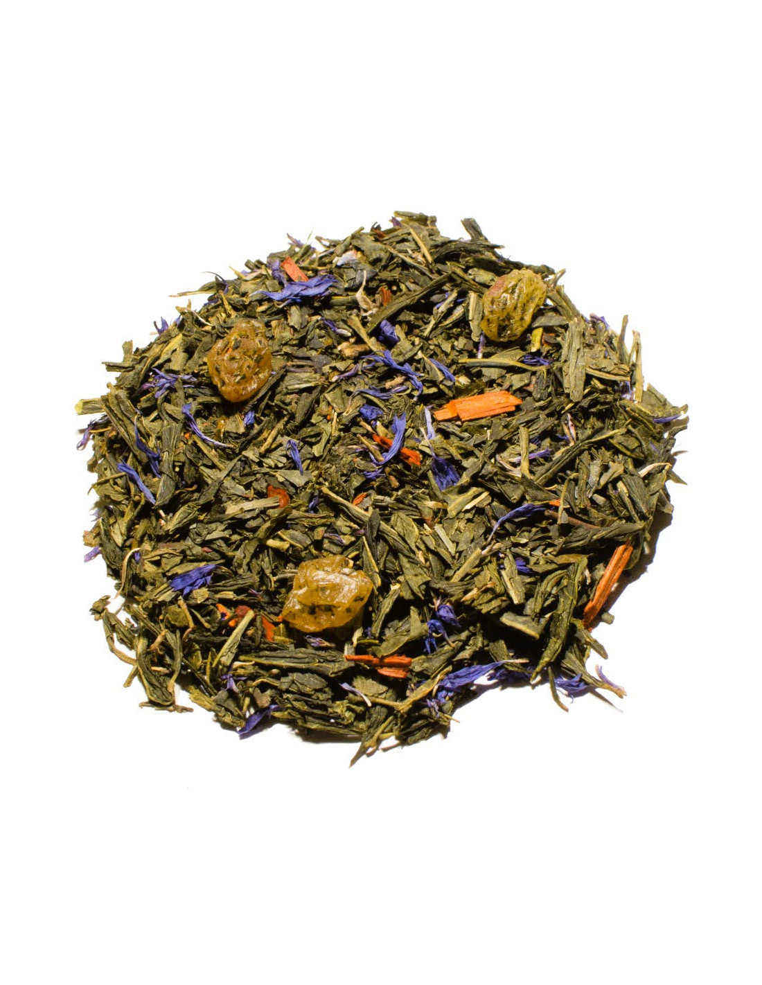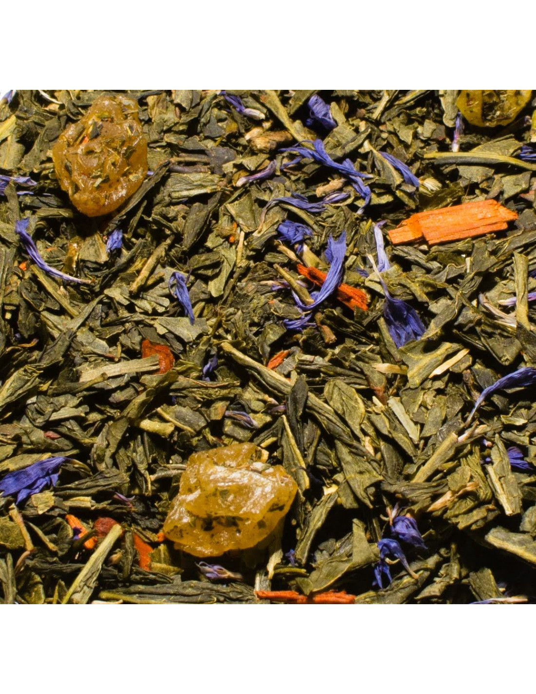 Thé vert Sencha de Chine, raisin blond, arôme raisin, arôme pêche de vigne, bois de santal, arôme cassis, fleurs de bleuet.