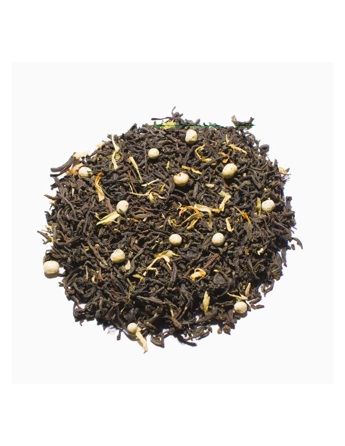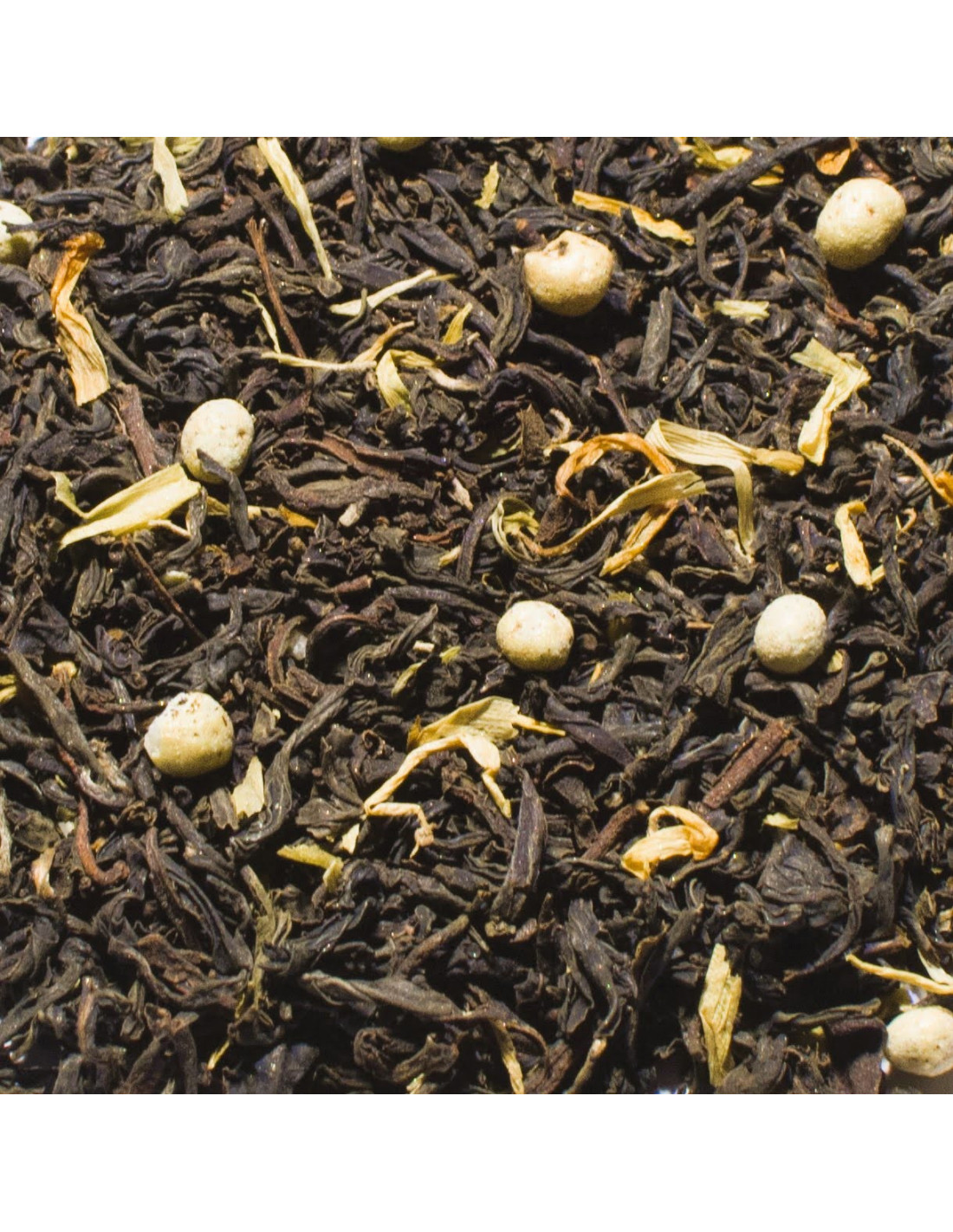 Thé noir de Chine, arôme pain d’épices, céréales croustillantes sucrées enrobées de chocolat, arôme orange douce, fleurs de souci.